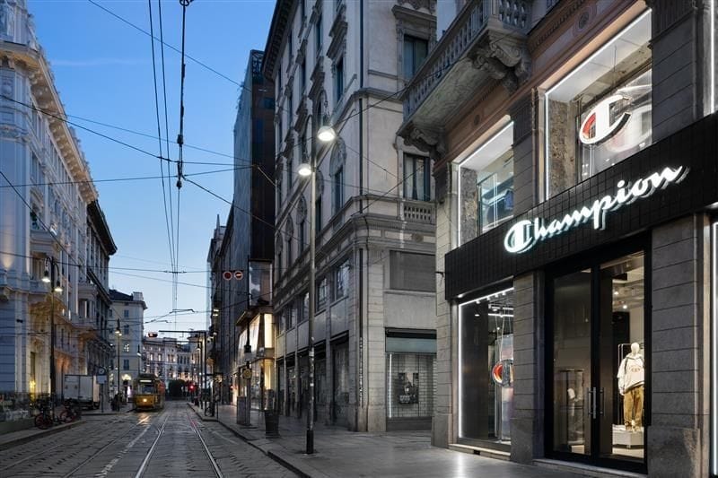 The flagship is located at Via Torino 19, one of Milan’s busiest commercial streets linking Duomo with the city’s youth and nightlife districts, and is described as the brand’s first full flagship in the city. The new Champion space spans roughly 890 square metres across multiple levels, combining retail areas, a dedicated showroom, and office spaces to manage brand and market activities from under one roof.