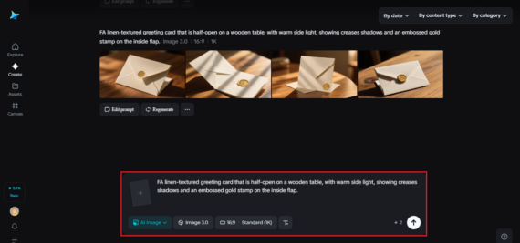 For example: “A linen-textured greeting card that is half-open on a wooden table, with warm side light, showing creases shadows and an embossed gold stamp on the inside flap.“